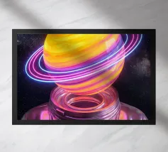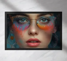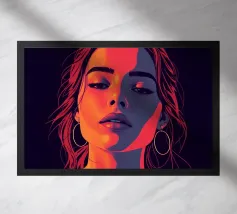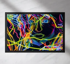 Un'opera d'arte digitale surreale presenta una donna con una felpa scura con cappuccio, il cui volto è illuminato da vibranti scie di luce al neon. I vortici multicolori e incandescenti le avvolgono la testa e il collo, creando un'atmosfera futuristica e onirica.