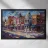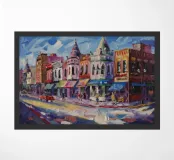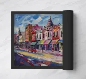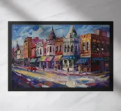 Una strada cittadina con edifici storici a più piani è immersa nella luce calda e brillante di un sole basso, che proietta lunghe ombre e crea una scena urbana vibrante ed energica con un tocco di nostalgia.