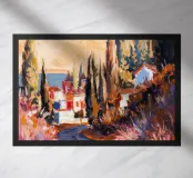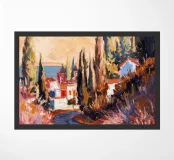 Una strada tortuosa fiancheggiata da alti cipressi è immersa nella calda luce dorata del crepuscolo; lo stile espressivo e pittorico crea un viaggio sognante e romantico attraverso la campagna.