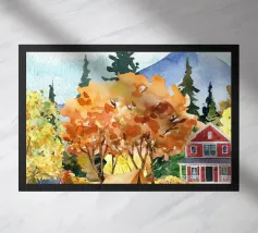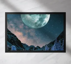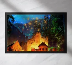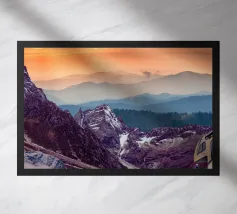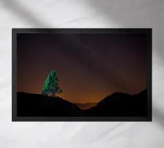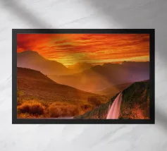 Una strada tortuosa attraversa un paesaggio montuoso, con un grande albero che spicca al centro. Il cielo passa da un verde intenso a un caldo arancione vicino all'orizzonte. Le montagne fiancheggiano la strada su entrambi i lati, alcune con cime innevate. La superficie stradale appare bagnata, riflettendo la luce ambientale. L'atmosfera generale è serena e pittoresca e cattura la bellezza della natura.