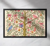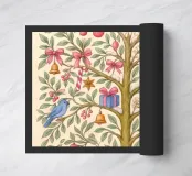 Un magico albero di Natale rosa pieno di sogni pastello: delicati cerbiatti, uccellini canterini, campanelle dorate e fiocchi rosa portano un dolce fascino festivo alla vostra casa. Ispirata ai libri di fiabe d'epoca e all'arte botanica, questa stravagante illustrazione unisce calore, natura e nostalgia. Perfetta per salotti accoglienti, camerette o come stampa murale per le vacanze senza tempo.