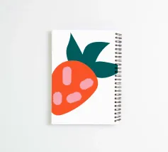 A stylized, simplistic representation of a strawberry features an orange body with three pink seeds and dark green leaves. The minimalistic design uses bold colors and shapes to evoke a playful and modern feel.