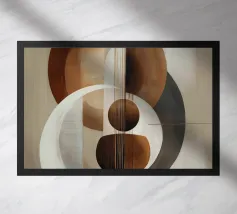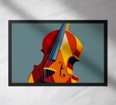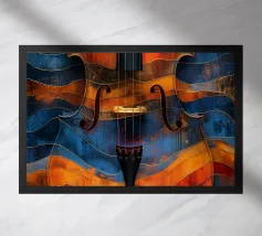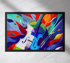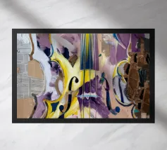 Un moderno dipinto astratto con forme geometriche che formano chitarre, violini e note musicali in una composizione audace e colorata. Lo sfondo strutturato e la disposizione dinamica evocano un senso di ritmo e di espressione artistica.