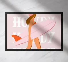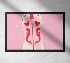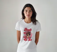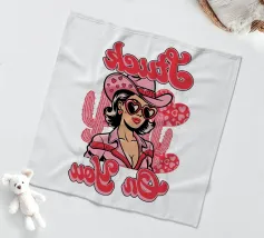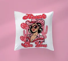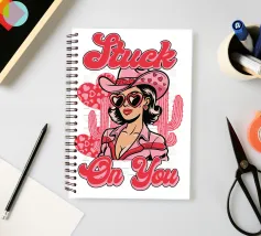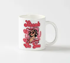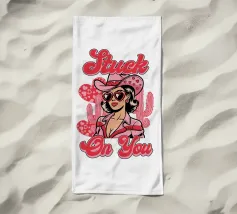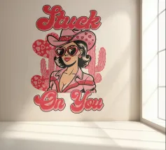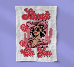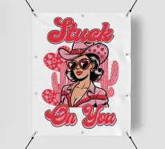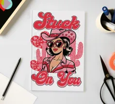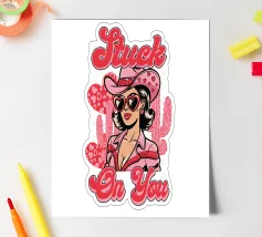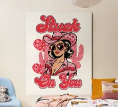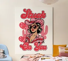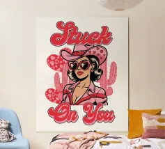 Una donna stilizzata che indossa un cappello da cowboy e occhiali da sole a forma di cuore è collocata su uno sfondo con cactus e cuori. La frase "Stuck On You" è ben visibile.