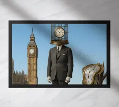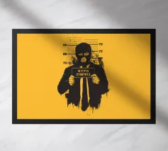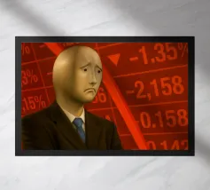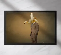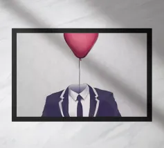 Immagine surreale di un uomo in abito formale nero e cravatta con la testa sostituita da una mano gigante che mostra un dito medio alzato. La mano regge un cartello di cartone con la scritta "WILL WORK FOR MONEY" su uno sfondo rosso.