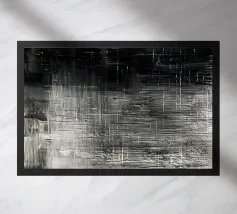 Tecnica mista (pittura acrilica ed elaborazione digitale aggiunta) espressiva, astratta e strutturata in un lunatico grigio ardesia scuro, blu indaco scuro e neutri sabbiosi. Un'opera grintosa e d'impatto per interni moderni.