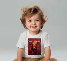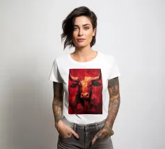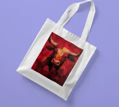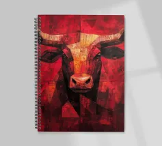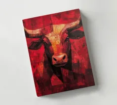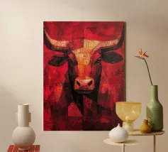 A commanding abstract portrayal of a bull’s head, constructed from layered planes, distressed textures, and intense tonal depth. Set against a powerful red field, the form feels monumental and symbolic, evoking strength, resolve, and raw presence. Fragmented surfaces and collage-like detailing add complexity, giving the piece a sense of history and weight beneath its bold exterior.