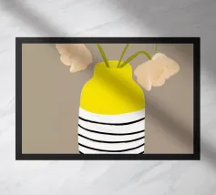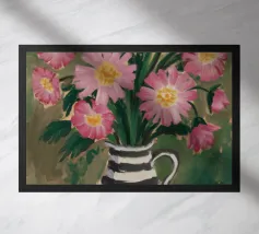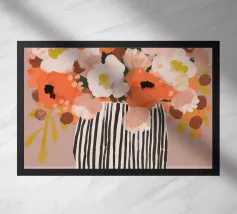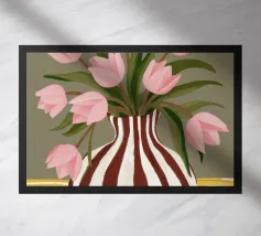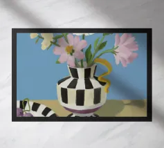 Questa illustrazione minimalista mostra un'elegante tazza di ceramica a righe bianche e nere, circondata da fiori rosa e foglie verdi. Sullo sfondo beige, l'allegro bouquet di fiori irradia leggerezza estiva e porta la freschezza botanica in ogni stanza!