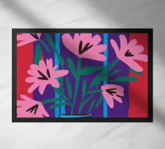 Un bouquet di fiori rosa in un vaso di terracotta poggia su una superficie a motivi rosa e neri. Lo sfondo è un blocco di turchese vibrante, che crea una composizione giocosa ed elegante che celebra il colore e il motivo.