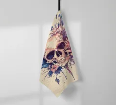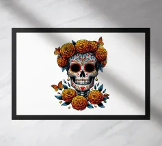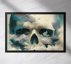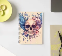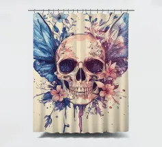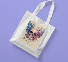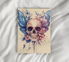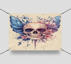 Un teschio realistico è abilmente circondato da fiori e grandi ali di farfalla. L'armoniosa palette di colori blu, rosa e beige crea un contrasto poetico tra vita e caducità.