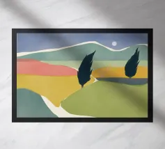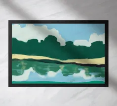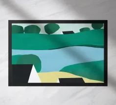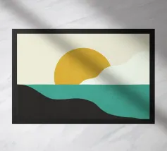 Una scena di spiaggia minimalista è rappresentata con forme geometriche decise e una tavolozza di colori limitata. Una barca a vela è parzialmente visibile dietro una duna di sabbia, mentre il mare tranquillo è affiancato da un fogliame scuro e semplificato.