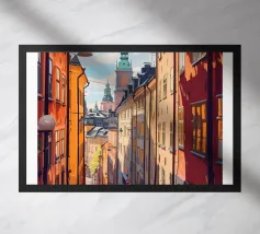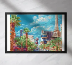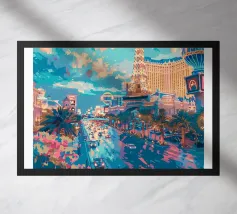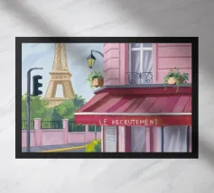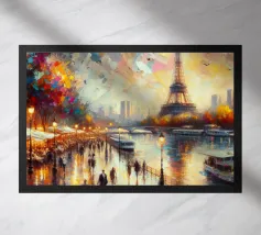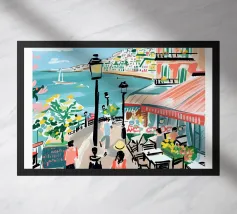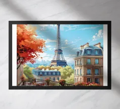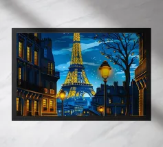 Vivete il romanticismo della Ville Lumière con questo affascinante poster di Parigi. L'opera raffigura una strada secondaria parigina per eccellenza, fiancheggiata da accoglienti caffè e bistrot con sedie in rattan e tende da sole colorate. La strada acciottolata conduce lo sguardo direttamente all'iconica Torre Eiffel, drammaticamente incorniciata tra gli edifici storici di Haussmannian. Il dipinto utilizza una tavolozza di colori vibranti e impressionistici con blu, rosa e viola intensi che riflettono l'eccellente atmosfera di una giornata di sole in città. Questo poster digitale di alta qualità (7000x5000 pixel, 300 dpi) è un perfetto pezzo di