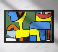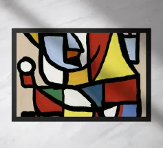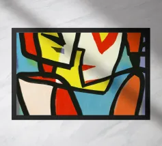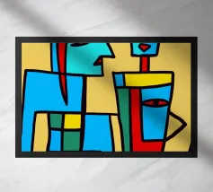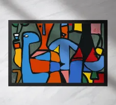 Due figure stilizzate dominano la composizione, caratterizzate da forme astratte e colori vivaci. Una figura appare di profilo mentre l'altra è rivolta in avanti, entrambe con tratti esagerati e una qualità stravagante.