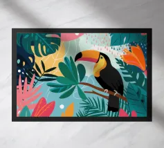 Una vivace illustrazione di due tucani dal becco colorato appollaiati su un ramo in mezzo a un rigoglioso fogliame tropicale, resa in uno stile grafico e audace.