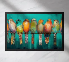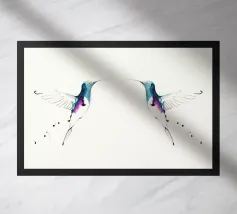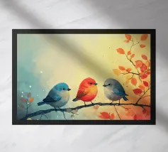 Disegno a inchiostro colorato di tre uccelli viola seduti uno accanto all'altro su un filo. Ognuno di loro è impegnato nelle proprie cose. Il viola è macchiato e spontaneo