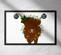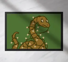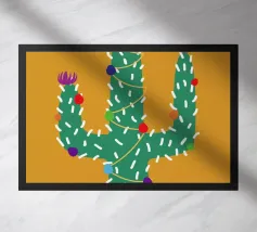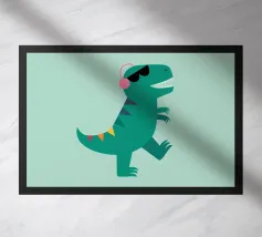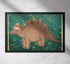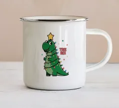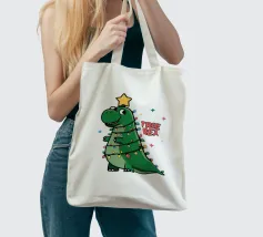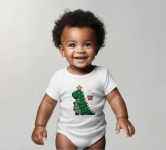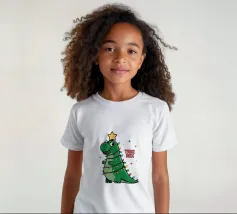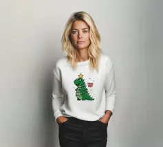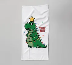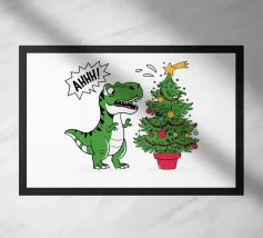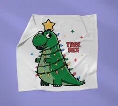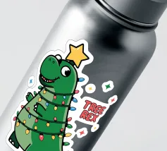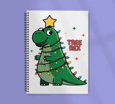 Un allegro dinosauro verde è decorato in modo spiritoso per assomigliare a un albero di Natale, con tanto di luci colorate e stella sulla testa. Le parole "Tree Rex" sono scritte in modo scherzoso accanto ad esso, per rendere ancora più festoso il tema.
