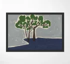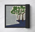 A simple representation of trees is featured with green foliage and brown trunks, standing beside a meandering blue shape that could be interpreted as water. Broad brushstrokes in gray and blue form the background, providing a contrast to the organic shapes of the trees.