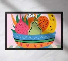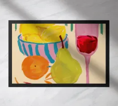 Una natura morta semplice e classica con una ciotola a righe con una mela, una pera e dell'uva, su uno sfondo rosa.