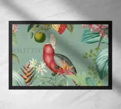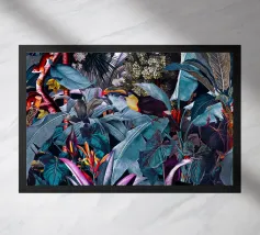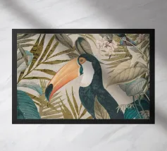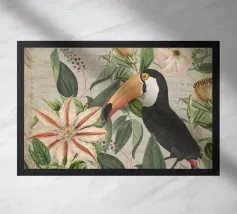 Questo elegante collage vintage è incentrato su un sorprendente tucano, il cui becco vibrante e le piume nere e lucide spiccano sul lussureggiante fogliame tropicale. Intorno al tucano si librano con grazia delicati colibrì, le cui ali iridescenti brillano nelle tonalità del blu e del verde. L'interazione tra l'audace presenza del tucano e il movimento leggero ed etereo dei colibrì crea una scena dinamica e armoniosa. Lo sfondo, con le sue sottili texture vintage, aggiunge profondità e un fascino nostalgico, mentre la ricca vegetazione e i colori vivaci evocano la bellezza di un paradiso esotico.