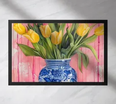 Una vivace natura morta di un bouquet di tulipani rosa in un audace vaso a righe bianche e blu. La composizione è fresca, grafica e piena di energia primaverile.