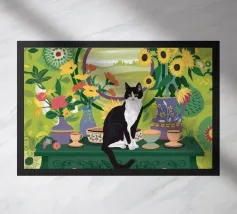 Un gatto bianco e nero siede tranquillamente su un tavolo coperto da un morbido panno rosa a fantasia. Accanto al gatto c'è un vaso giallo che contiene un bouquet di grandi tulipani rosa. Lo sfondo è costituito da una parete verde menta con ombre di foglie e da una carta da parati tropicale con motivi botanici verdi e rosa. La scena è tranquilla ed equilibrata, con un mix giocoso di comfort interno e lussureggianti elementi decorativi.