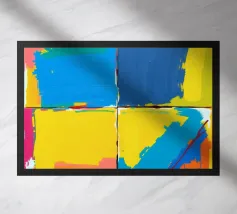 Quest'opera d'arte presenta una vivace disposizione di colori tra cui blu, rosa, giallo e arancione. La luce naturale crea contrasti sorprendenti, esaltando la profondità testuale del dipinto.