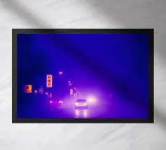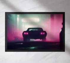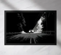 Un'auto retrò illumina una notte nebbiosa, creando una scena urbana piena di mistero e nostalgia. Perfetto per gli amanti del design senza tempo e della fotografia cinematografica.