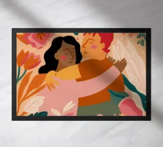 Questa opera d'arte mostra due persone che si abbracciano, con uno sfondo rosa e il simbolo di un cuore sopra di loro. I colori caldi e la posa affettuosa trasmettono un senso di amore e calore.