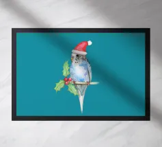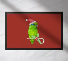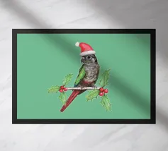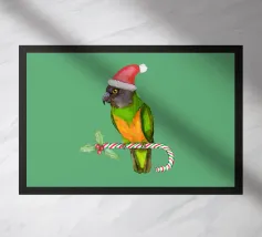 Illustrazione vettoriale digitale di un simpatico cacatua dalla cresta salmonata. Indossa un cappello natalizio e tiene in mano una caramella decorata con agrifoglio.