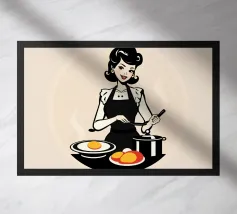 Una donna con il grembiule mescola gli ingredienti in una ciotola, irradiando calore e gioia in un'accogliente cucina, sottolineando la gioia dei pasti fatti in casa.
