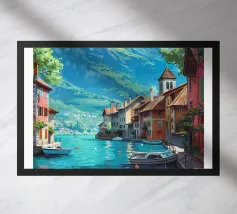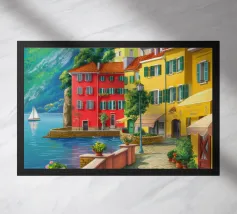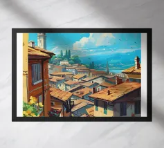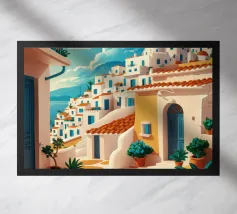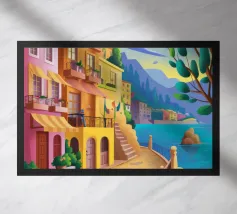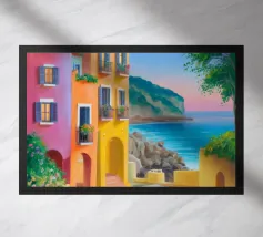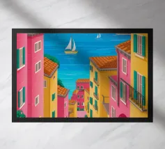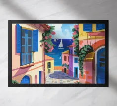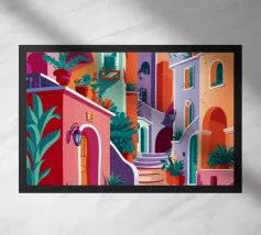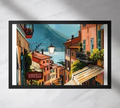 Una veduta prospettica di una strada europea stretta e tortuosa, fiancheggiata da edifici colorati, piante in vaso e diretta verso un cielo luminoso e nuvoloso.