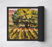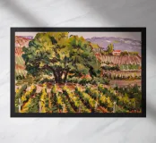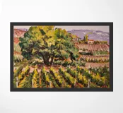 Rigogliosi e verdi filari di vite si estendono su un paesaggio inondato di sole nella classica tradizione dei vigneti europei, trasmettendo un senso di abbondanza e il ritmo pacifico della vita di campagna.