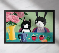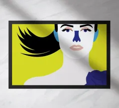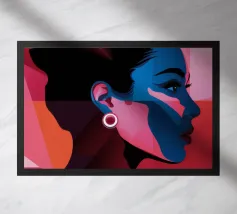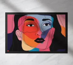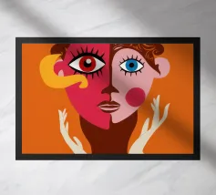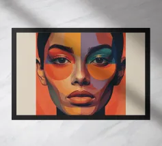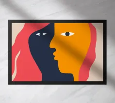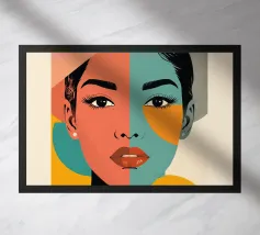 Un suggestivo ritratto astratto di un volto di donna, diviso in due metà, una nera e una bianca, con labbra rosse e capelli fluenti su un caldo sfondo arancione.