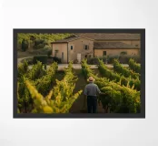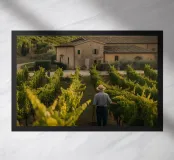 Questo disegno cattura l'essenza pacifica della vita rurale italiana: un uomo che cammina lentamente tra i vigneti, immerso in una luce dorata, di fronte a un tipico casale in pietra. L'atmosfera è quella della lentezza, della tradizione e della bellezza naturale delle terre mediterranee. Perfetto per gli amanti dei paesaggi agricoli, della Toscana e dei momenti sospesi nel cuore dei vigneti.