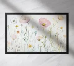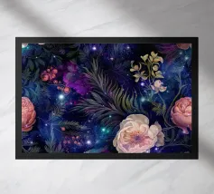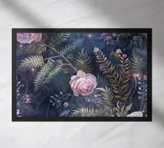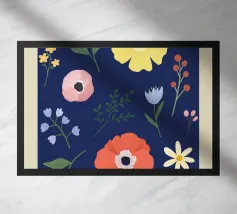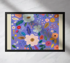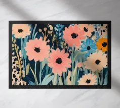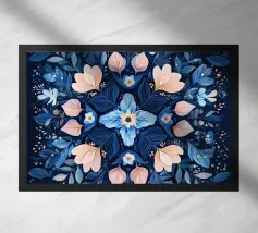 Questa opera d'arte floreale presenta un ricco sfondo acrilico blu scuro, che crea un contrasto sorprendente con i fiori e i rami in stile naif dipinti a mano che incorniciano la composizione. I fiori, nei toni tenui del blush e nelle tonalità calde, sono astratti e di una semplicità affascinante, che evoca un senso di innocenza e capriccio. Le pennellate delicate e la tavolozza calda conferiscono un'atmosfera accogliente e invitante, mentre lo sfondo blu scuro aggiunge profondità e raffinatezza. Il pezzo irradia un equilibrio di calore e serenità, perfetto per un'atmosfera rilassante ma visivamente coinvolgente.