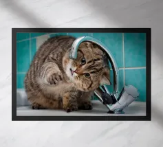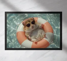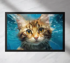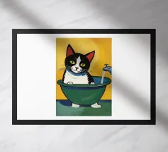 Un soffice gatto con gli occhi spalancati è seduto in una vasca da bagno piena di bolle, circondata da un bagno floreale azzurro e rosa. La scena offre un'espressione stravagante e leggermente sorpresa del gatto bagnato.