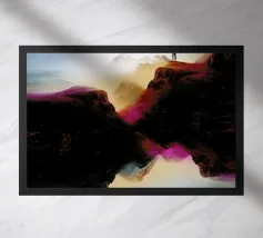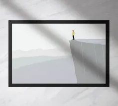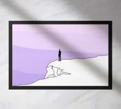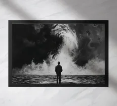 Questa illustrazione digitale in bianco e nero ritrae una ragazza in piedi ai margini di un paesaggio montano capovolto - un riflesso ossessionante del suo tumulto interiore e del suo isolamento. Circondata da cime frastagliate che emergono da un abisso, la ragazza cerca disperatamente di fare chiarezza, ma il mondo che la circonda rimane uno specchio di confusione. Il netto contrasto tra luce e buio, evidenziato dal mezzo digitale, amplifica il suo senso di disconnessione. Ogni passo è incerto, perché la donna affronta sia la vastità del paesaggio sia il caos silenzioso che lo circonda. Le montagne sono testimoni silenziosi del suo viaggio, dove
