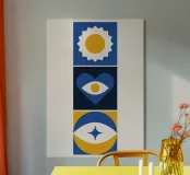 Un'impressionante e moderna stampa d'arte digitale a trittico con tre disegni geometrici astratti unici in un'armoniosa tavolozza di blu navy profondo, blu reale vibrante e giallo senape caldo. I pannelli presentano forti motivi simbolici: il pannello superiore presenta un sole stilizzato con raggi frastagliati; il pannello centrale mostra un occhio astratto all'interno di un grande cuore; il pannello inferiore combina cerchi e una forma di occhio contenente una stella. Questo pezzo fonde con successo i principi geometrici del Bauhaus con un'estetica contemporanea Boho Minimalista. Offerto in un file digitale di qualità superiore (7000x5000 pixel, 300 dpi), garantisce un'espe