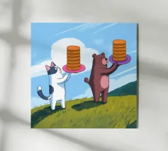 Un panorama innevato invita un cane e un gatto a raggiungere una porta dove un pupazzo di neve è in attesa. L'ambiente gelido e l'invito giocoso incarnano il fascino della magia invernale.