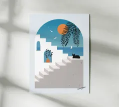 Un'incantevole illustrazione di un gatto nero seduto sui gradini di una bella città di mare, con edifici resi in rosa tenue. La scena è tranquilla, pittoresca e piena di fascino mediterraneo.