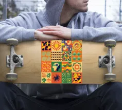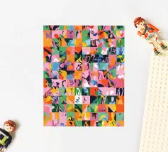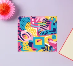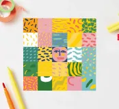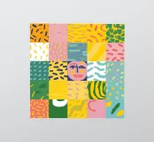 Una composizione astratta vibrante ed energica con un volto stilizzato integrato in un patchwork colorato di motivi geometrici. L'opera è un'esplorazione moderna e giocosa dell'identità e della forma.