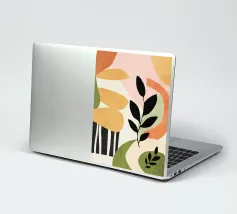 Foglie stilizzate in nero e verde si stagliano su uno sfondo di strisce curve e fluide in morbide tonalità di terra. Il disegno combina elementi botanici con forme geometriche astratte per un look moderno.