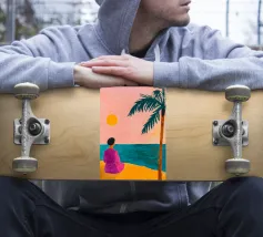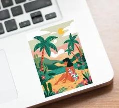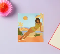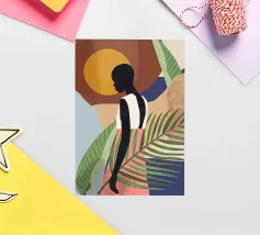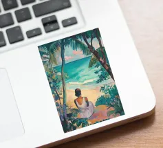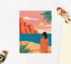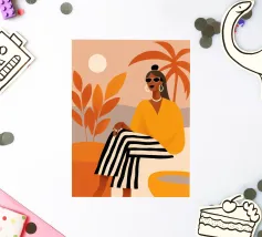 Graceful digital painting of a confident woman in a flowing white robe seated on a rocky beach with palm trees and a vibrant orange sun. This stylish, serene coastal scene evokes luxury, calm, and tropical vibes. Perfect for fashion lovers, modern art enthusiasts, and tropical home decor. Adds sophistication and warmth to living rooms, bedrooms, or offices. Ideal gift for art collectors and fans of contemporary portraiture with a beach-inspired theme.