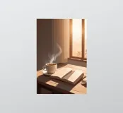 Una rilassante scena minimalista di una tazza di caffè fumante accanto a un libro aperto, immerso nella luce del sole mattutino. Celebra la bellezza delle mattine tranquille e della solitudine riflessiva.