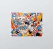 Questo dipinto astratto in acrilico cattura l'energia dinamica della tecnica dell'action painting, ispirata a Pollock. Vibranti schizzi di colore in rosso, giallo, blu e bianco creano linee fluide e motivi complessi che trasmettono movimento e profondità.