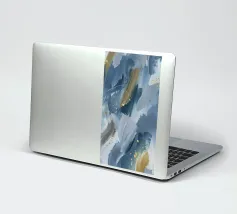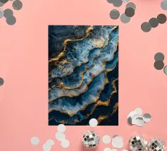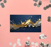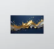 Una composizione astratta che mostra onde dinamiche di oro e argento, intrecciate con spruzzi vibranti su uno sfondo blu profondo, ideale per sfondi desktop e sfondi artistici.