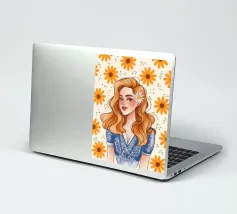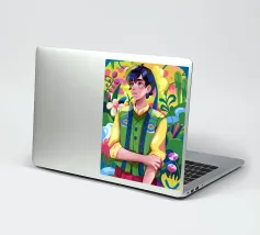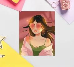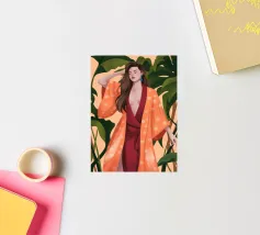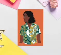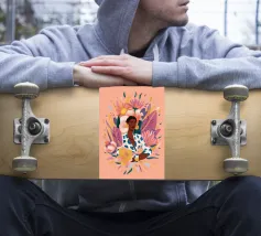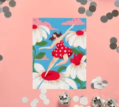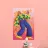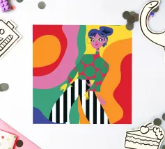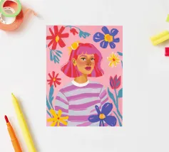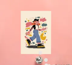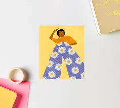Questa opera d'arte raffigura una persona con un vivace top giallo a fiori e pantaloni blu, che assume una posa dinamica su uno sfondo rosa con motivi floreali arancioni.