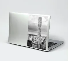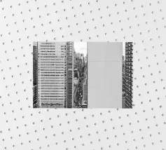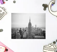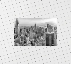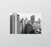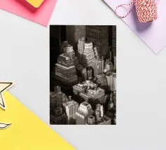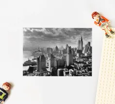 Stunning black and white photograph captures the Manhattan skyline, showing the towering skyscrapers and their elegant facades in a geometric composition from an aerial perspective. With visible reflections in daylight, this luxury poster epitomises modern artistry and is a stylish addition to contemporary interiors.