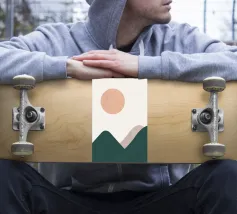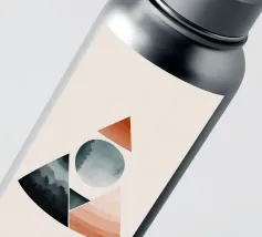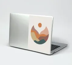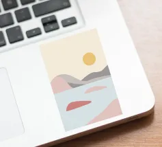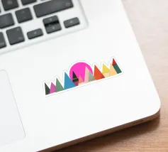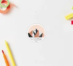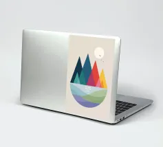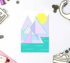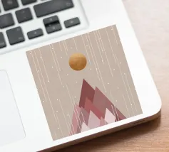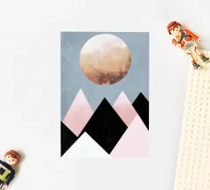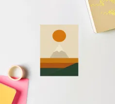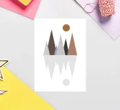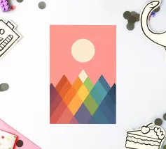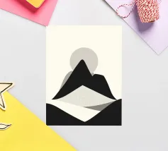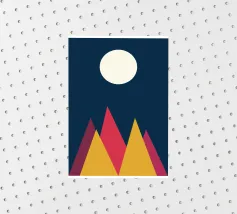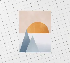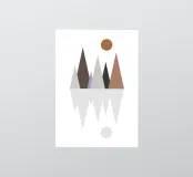 Le forme geometriche formano un paesaggio montano minimalista, con un cerchio in alto che ricorda il sole. Sotto è raffigurato un riflesso invertito delle cime, che crea un disegno simmetrico.