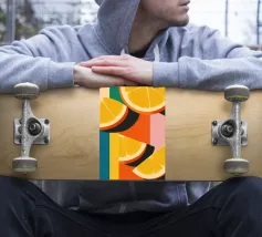 A graphic, pop art style pattern of orange slices against a dark blue background. The composition is modern, vibrant, and a fresh, zesty, and stylish design.